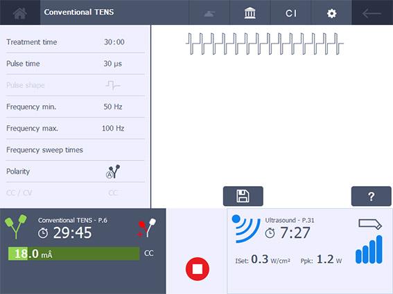 • Nízko- a středofrekvenční proudy: stejnosměrné, diadynamické (MF, RS, DF, CP, LP), TENS, NMES, interferenční (2 a 4 pólová interference,  4 pólová interference s rotací vektoru)